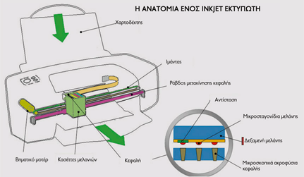 Η τεχνολογία εκτύπωσης inkjet, όπως άλλωστε και η εκτύπωση laser, είναι μια μέθοδος μη επαφής με το προς εκτύπωση υλικό ή υπόστρωμα. Το μελάνι, ψεκάζεται από μικροσκοπικά ακροφύσια που βρίσκονται σε μικρή απόσταση από το χαρτί, σε προκαθορισμένα σημεία, μέχρι τον τελικό σχηματισμό της εικόνας. Χρησιμοποιούνται τα τέσσερα βασικά χρώματα, το γνωστό μοτίβο CMYK (Cyan Magenta Yellow Black), τα οποία διαμέσω των κεφαλών εκτύπωσης εκτοξεύονται υπό τη μορφή μικρών σταγονιδίων προς το χαρτί στο οποίο επικάθονται υπό τη μορφή μικροσκοπικών κουκκίδων. Σήμερα βέβαια υπάρχουν εκτυπωτές inkjet με περισσότερα χρώματα που βελτιστοποιούν τη χρωματική απόδοση και πιστότητα της τελικής εκτύπωσης. Με εξαίρεση λίγα μονάχα μοντέλα, το σύστημα εκτύπωσης (κεφαλή εκτύπωσης) κινείται επί ενός οριζόντιου προς το χαρτί άξονα και ψεκάζει κάθε φορά σε οριζόντια λωρίδα τα μελάνια που απαιτούνται. Το χαρτί μετακινείται κάθετα προς τον άξονα της κεφαλής εκτύπωσης και η διαδικασία επαναλαμβάνεται μέχρι να σχηματιστεί η τελική εικόνα.