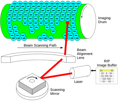 Η πρώτη δουλειά του εκτυπωτή είναι να μεταφράσει τις πληροφορίες της εικόνας σε bitmap. Αυτό γίνεται από τον εσωτερικό επεξεργαστή του εκτυπωτή και το αποτέλεσμα είναι μια «εικόνα» στη μνήμη του εκτυπωτή κάθε κουκκίδας η οποία θα επικολληθεί αργότερα στο χαρτί. Στην καρδιά κάθε laser εκτυπωτή βρίσκεται ένα μικρό περιστρεφόμενο τύμπανο γνωστό και ως Organic Photo Conductive Cartridge (OPC) με ειδική επίστρωση που επιτρέπει τη συγκράτηση της ηλεκτροστατικής φόρτισης. Ακολούθως, μια ακτίνα laser σαρώνει την επιφάνεια του τυμπάνου σχηματίζοντας το σχήμα της προς εκτύπωσης εικόνας. Η επιφάνεια του τυμπάνου είναι πάντα η ίδια με την επιφάνεια (μέγεθος) του χαρτιού που χρησιμοποιείται. Το χαρτί πριν φτάσει στο τύμπανο φορτίζεται αρνητικά από ένα κατάλληλο ηλεκτρικό σύστημα. Καθώς το χαρτί έρχεται σε επαφή με το τύμπανο έλκει μαγνητικά τα σωματίδια του toner που έχουν ήδη επικολληθεί στο τύμπανο με αποτέλεσμα τα σωματίδια αυτά να επικολλούνται στο χαρτί και να σχηματίζουν (τυπώνουν) την τελική εικόνα πάνω σε αυτό. Όλη η φιλοσοφία στηρίζεται σε θετικά και αρνητικά φορτισμένες επιφάνειες με ηλεκτρικό τρόπο και στη μεταξύ τους μαγνητική έλξη. Το toner ή καλύτερα τα σωματίδια του toner που έχουν ήδη επικολληθεί στο χαρτί είναι ειδικά σχεδιασμένα να λιώνουν πολύ γρήγορα. Το χαρτί περνάει μέσα από ένα θερμό σύστημα που ταυτόχρονα ασκεί και πίεση έτσι ώστε τα σωματίδια αυτά να λιώσουν και να απορροφηθούν από το χαρτί. Το τελευταίο στάδιο περιλαμβάνει τον καθαρισμό του toner ώστε να αρχίσει ξανά η διαδικασία.